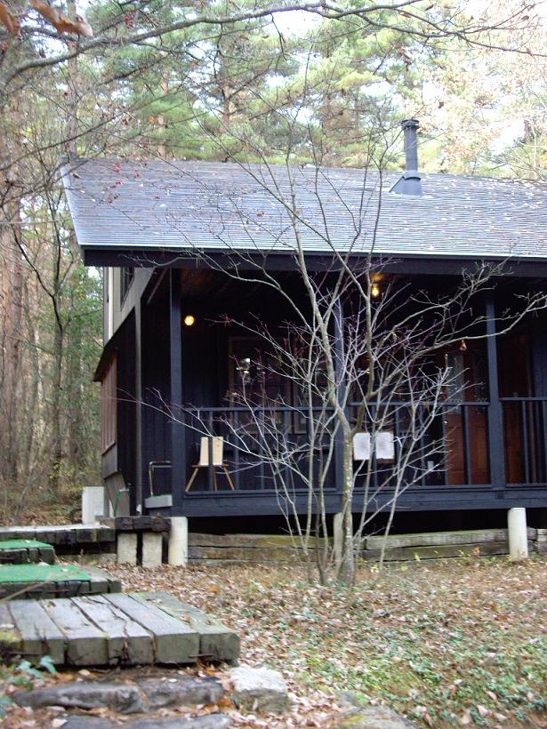 落葉樹の小径の奥に佇む一軒家。中はアトリエ風で、本がいっぱい。