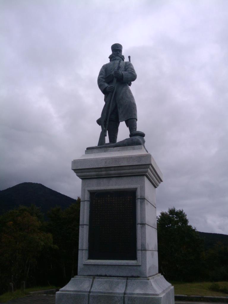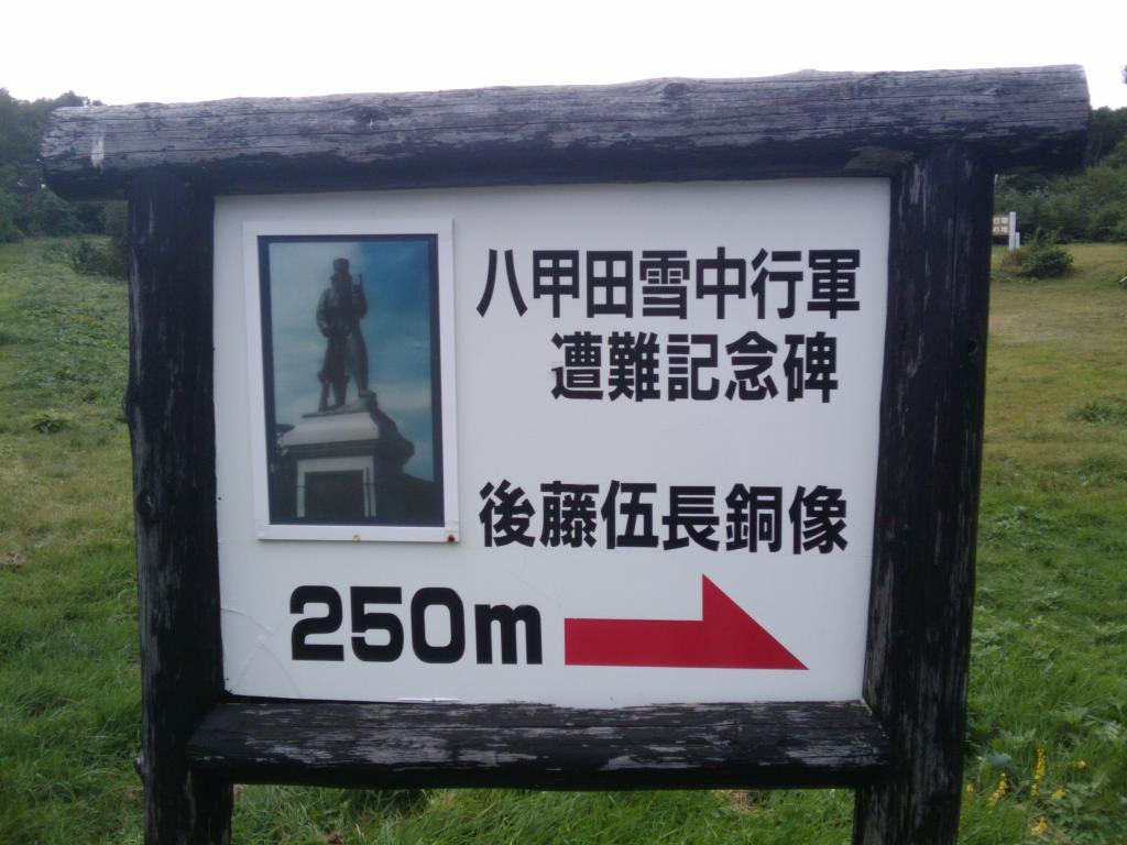 210名中193名が亡くなるという悲劇の現場であります。生存者である後藤伍長は伝令に走ったもののこの地で豪雪に倒れ、仮死状態のまま佇立しているのを捜索隊に発見されたそうな。この像はその時の姿を写したものらしい。事件の2年後の明治37年に竣工したという歴史ある銅像。